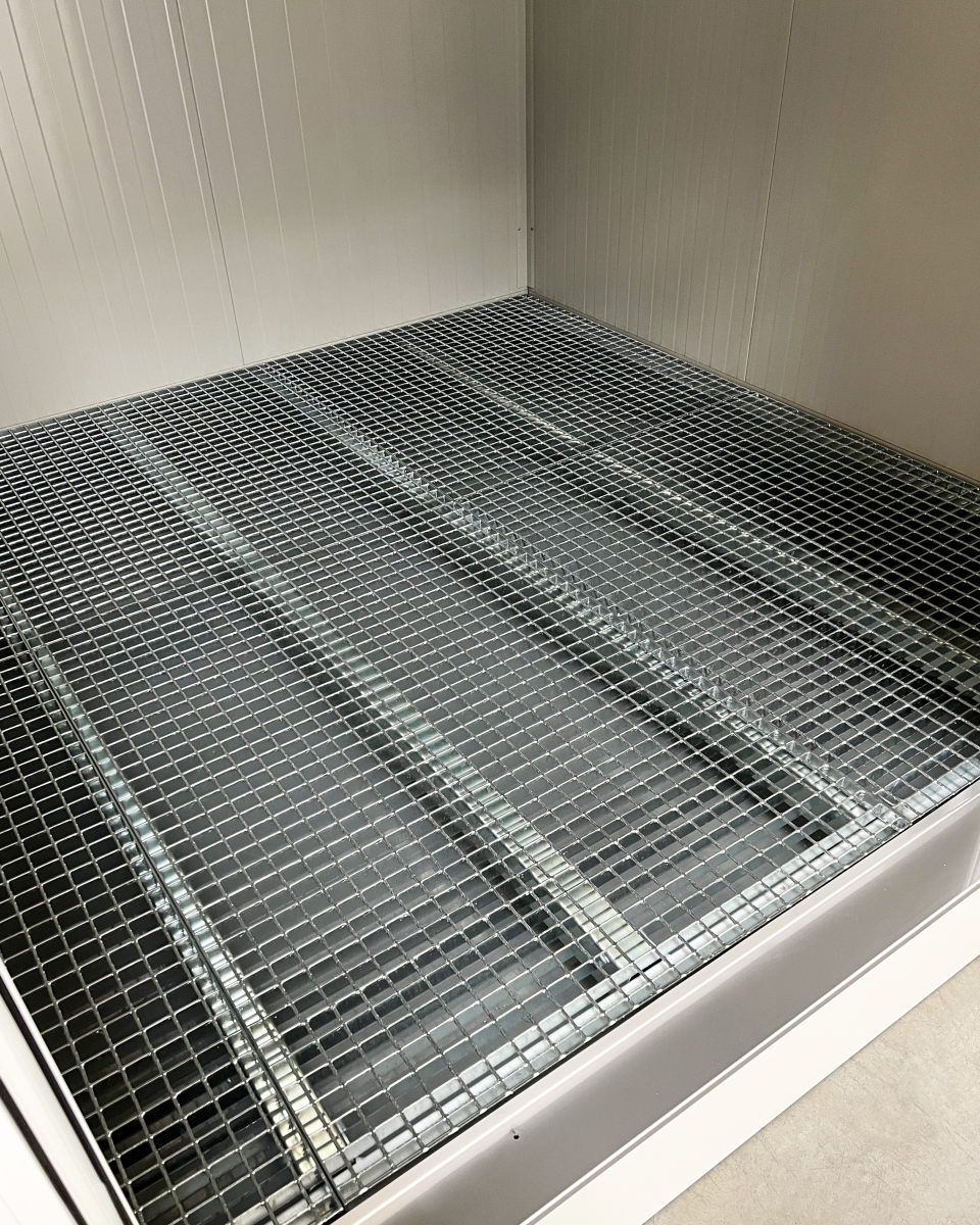 La sottostante vasca di raccolta in polipropilene (sp. 10 mm), completa di bordi perimetrali saldati a tenuta stagna, funge da contenimento di eventuali fuoriuscite o perdite dei rispettivi contenitori. Al centro della vasca è presente un pozzetto di raccolta che serve a svuotare il contenuto tramite elettro-pompa. Il pavimento è in grigliato elettroforgiato zincato a caldo.
