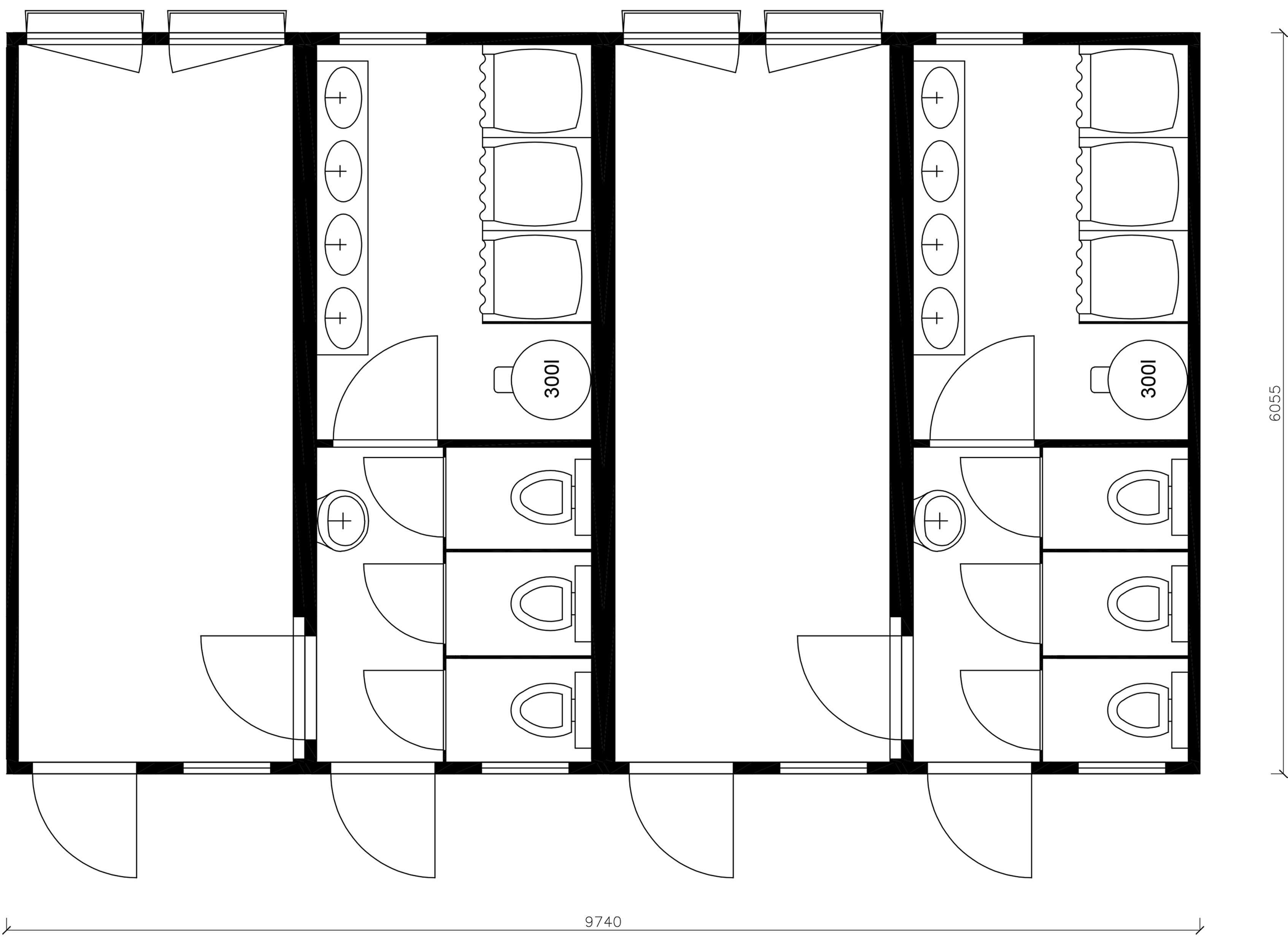 Modulo prefabbricato accoppiato destinato ad uso Spogliatoio per 10+10 persone, diviso in due aree (ad esempio fruibili come uomo / donna) composte da spogliatoio + bagno con wc, lavabi e box docce.
