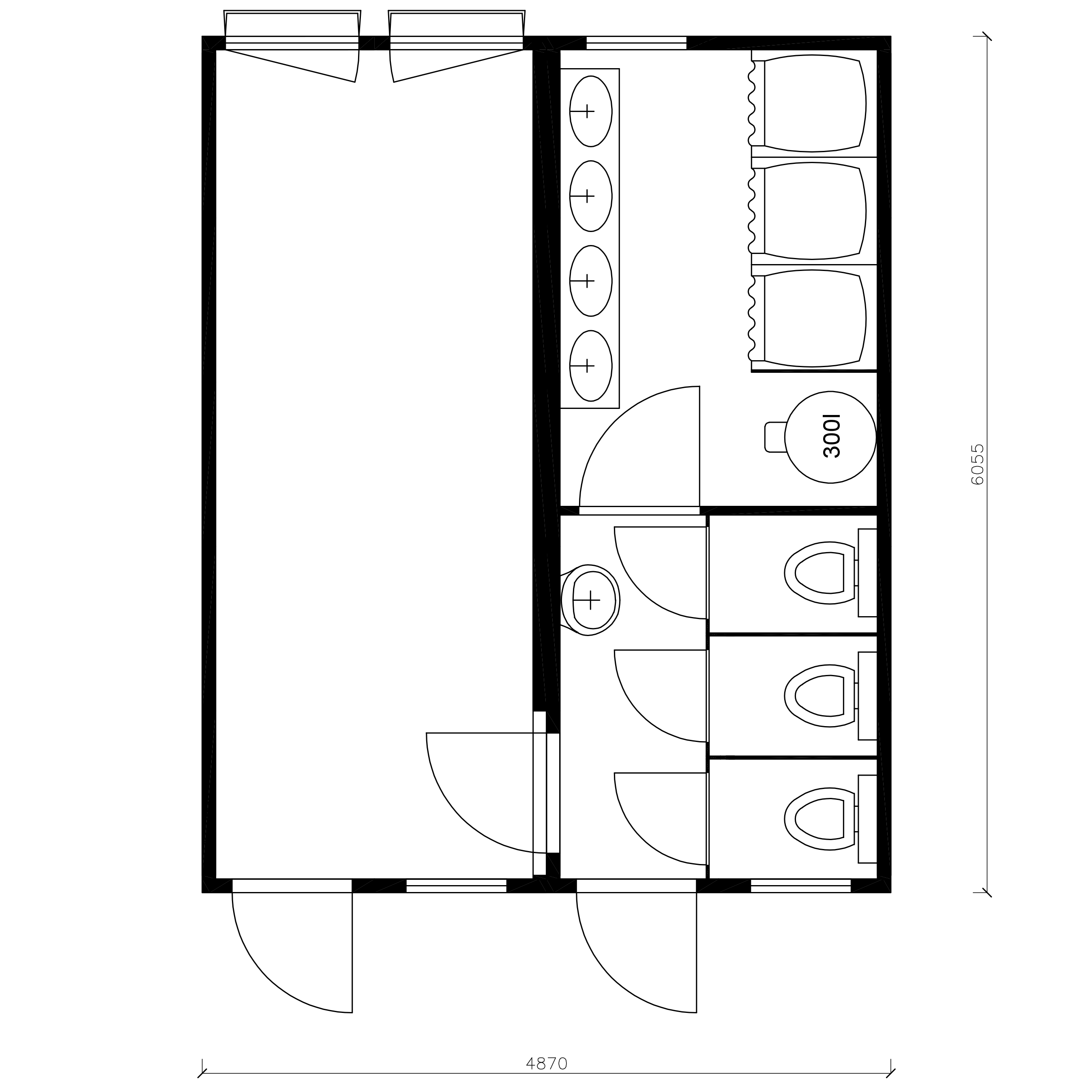 Modulo prefabbricato accoppiato destinato ad uso Spogliatoio per 10 persone, composto da area spogliatoio + bagno con wc, lavabi e box docce.