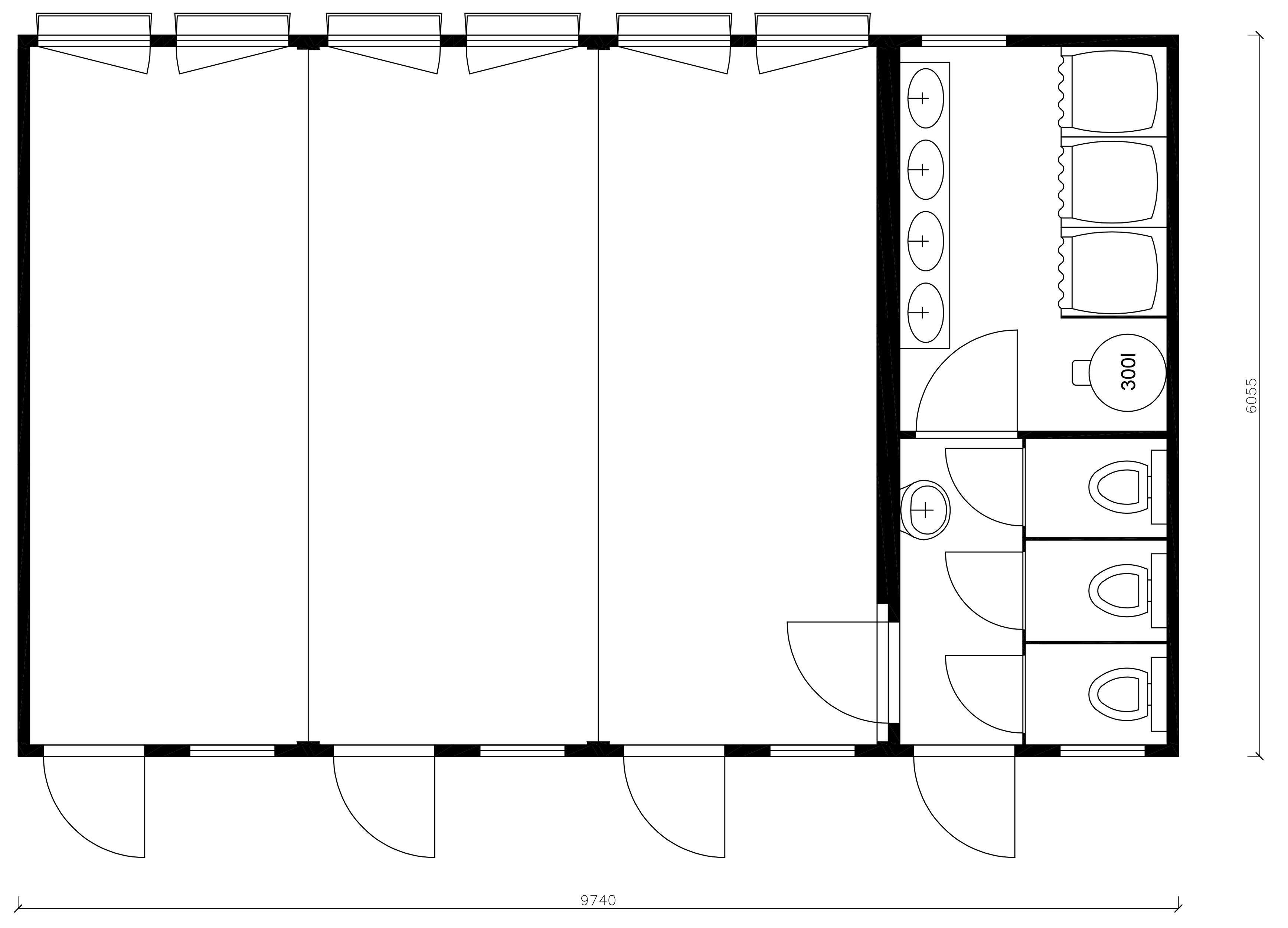 Modulo prefabbricato composto destinato ad uso Spogliatoio per 30 persone, composto da area spogliatoio + bagno con wc, lavabi e box docce.