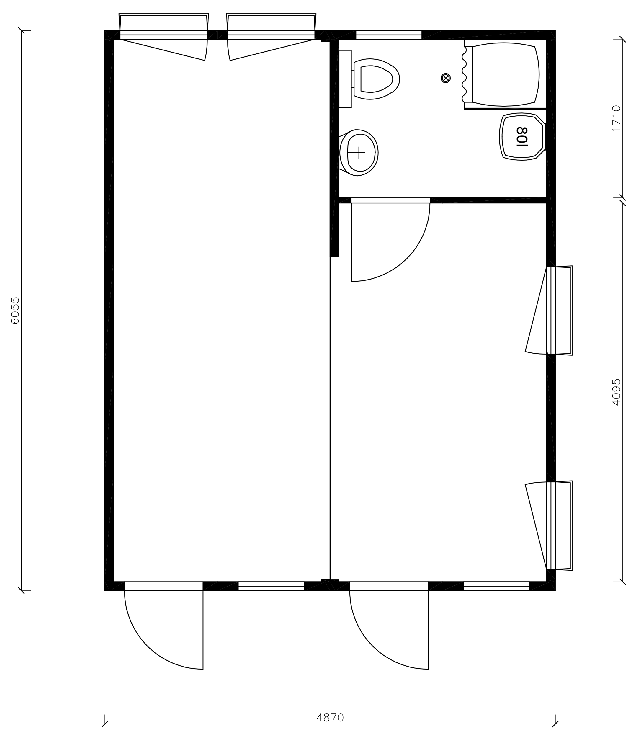 Modulo prefabbricato accoppiato destinato ad uso ufficio, composto da un'unica area con un bagno, con porte sul lato corto e finestre su entrambi i lati.