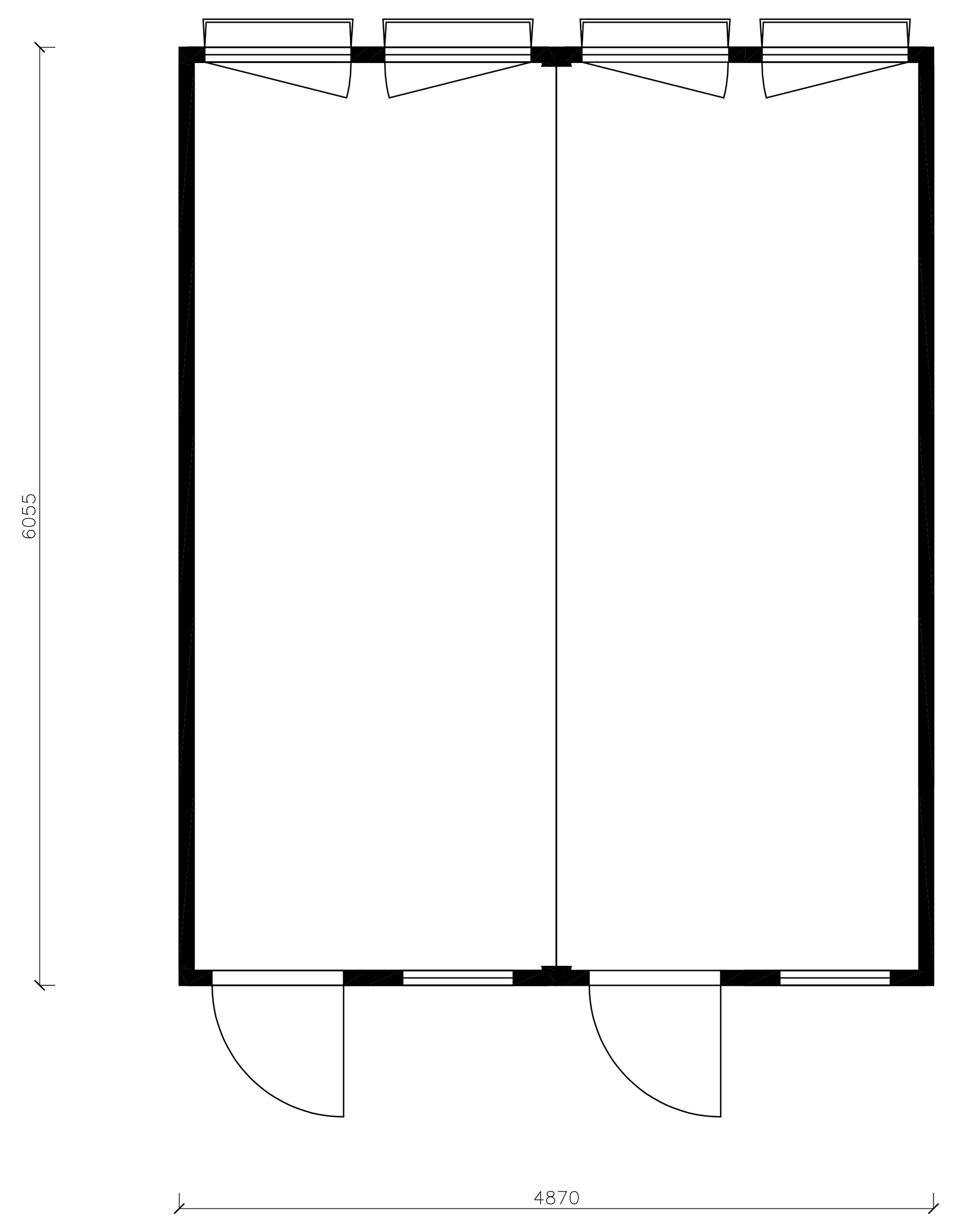 Modulo prefabbricato accoppiato destinato ad uso ufficio, composto da un'unica area, con porte sul lato corto e finestre sul lato opposto.