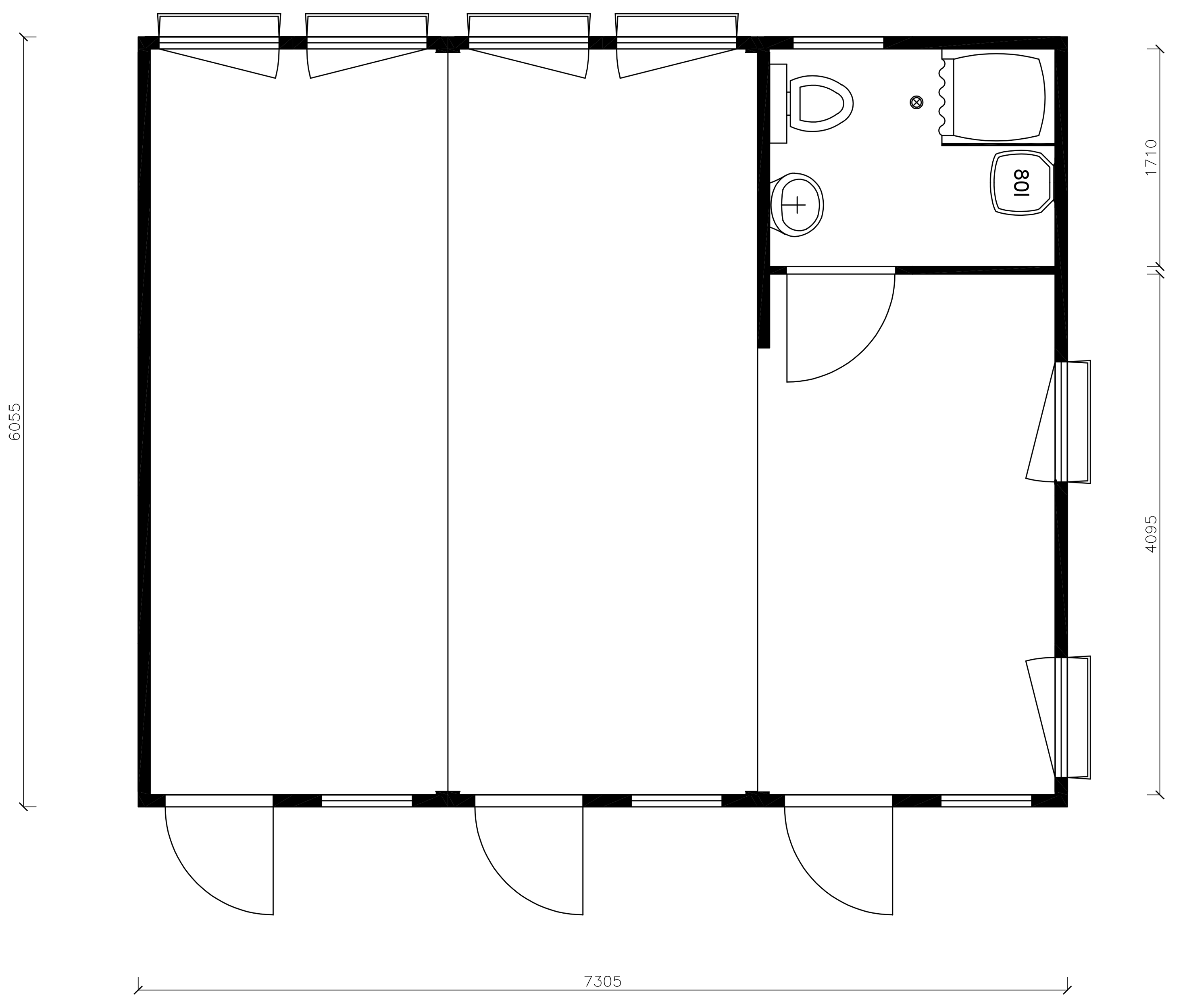 Modulo prefabbricato composto destinato ad uso ufficio, composto da un'unica area con un bagno, con porte e finestre sui lati opposti.