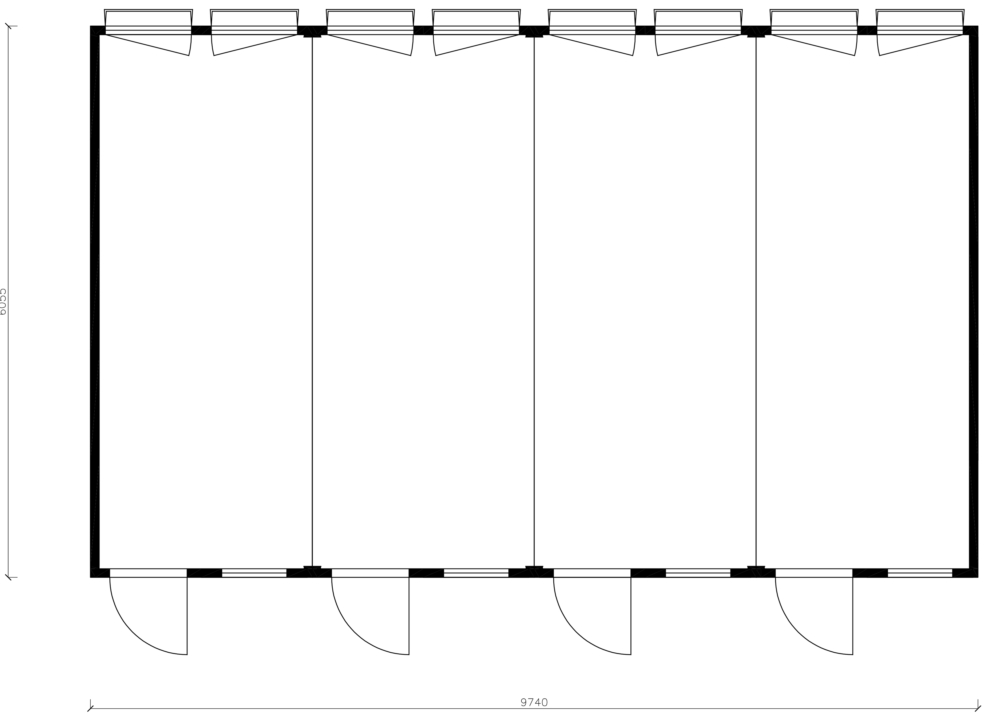 Modulo prefabbricato composto destinato ad uso ufficio, composto da un'unica area, con porte e finestre sui lati opposti.
