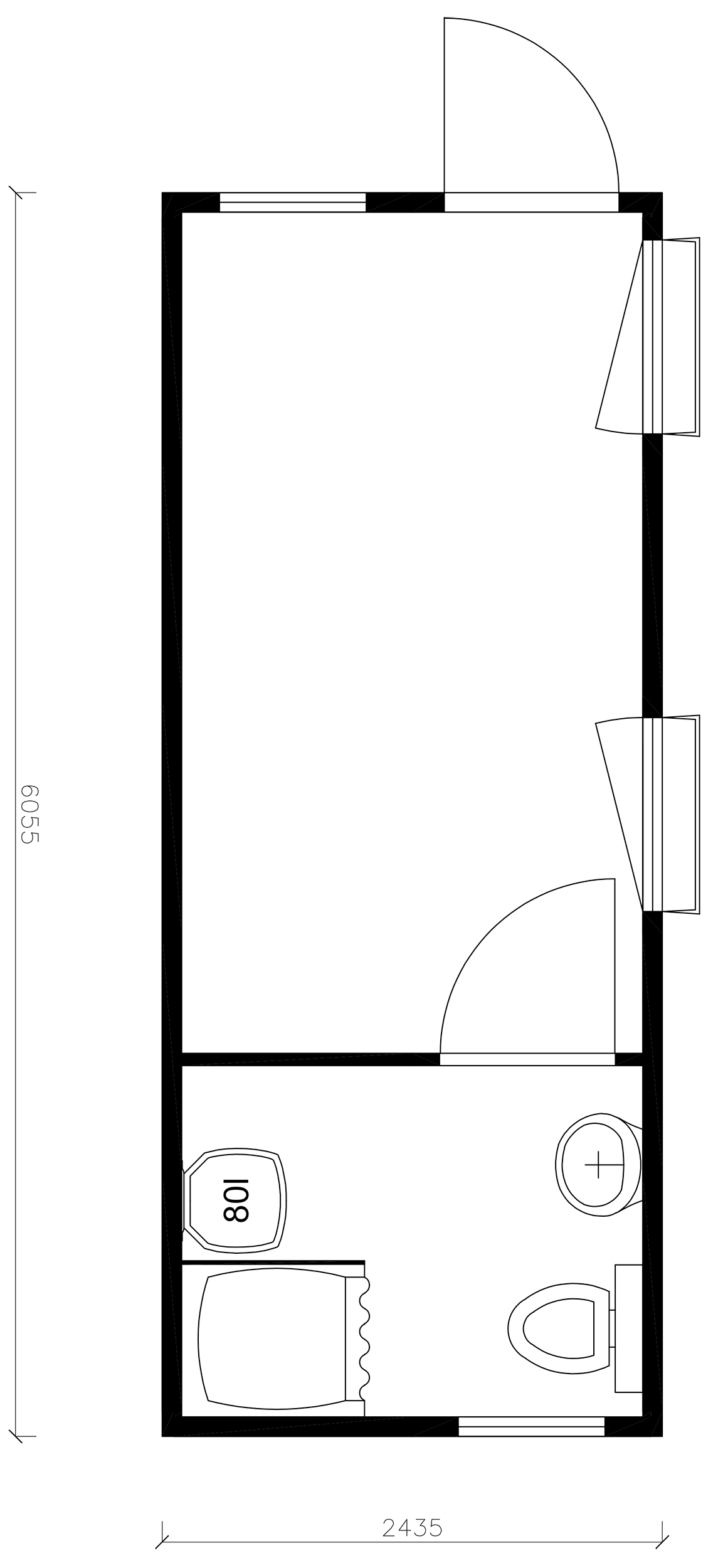 Modulo prefabbricato singolo destinato ad uso Ufficio, composto da un'unica area con un bagno, con porta sul lato corto e finestre sul lato lungo.