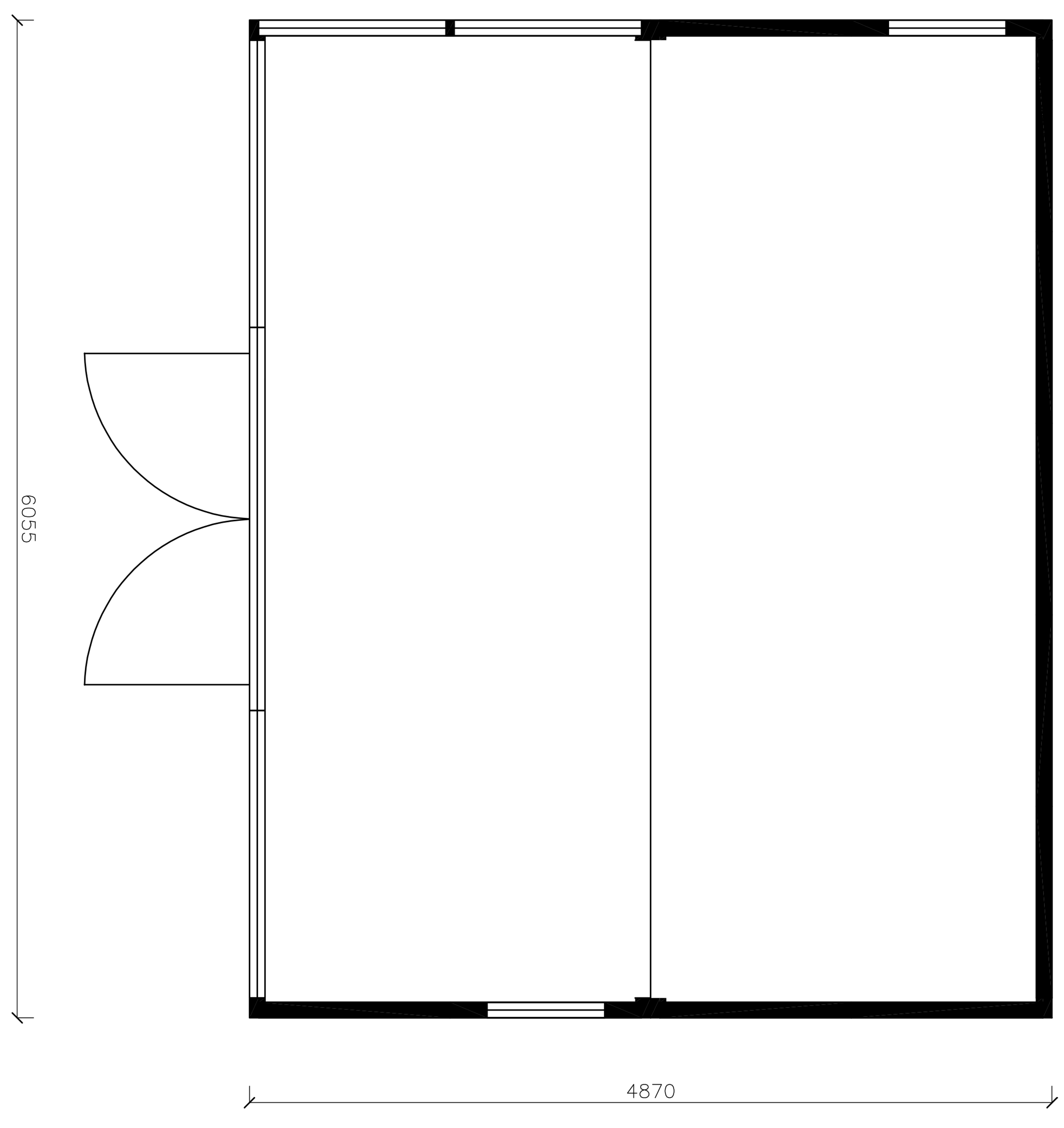Modulo prefabbricato doppio con un lato lungo + un lato corto vetrati, composto da un'unica area, con porta sul lato lungo.
