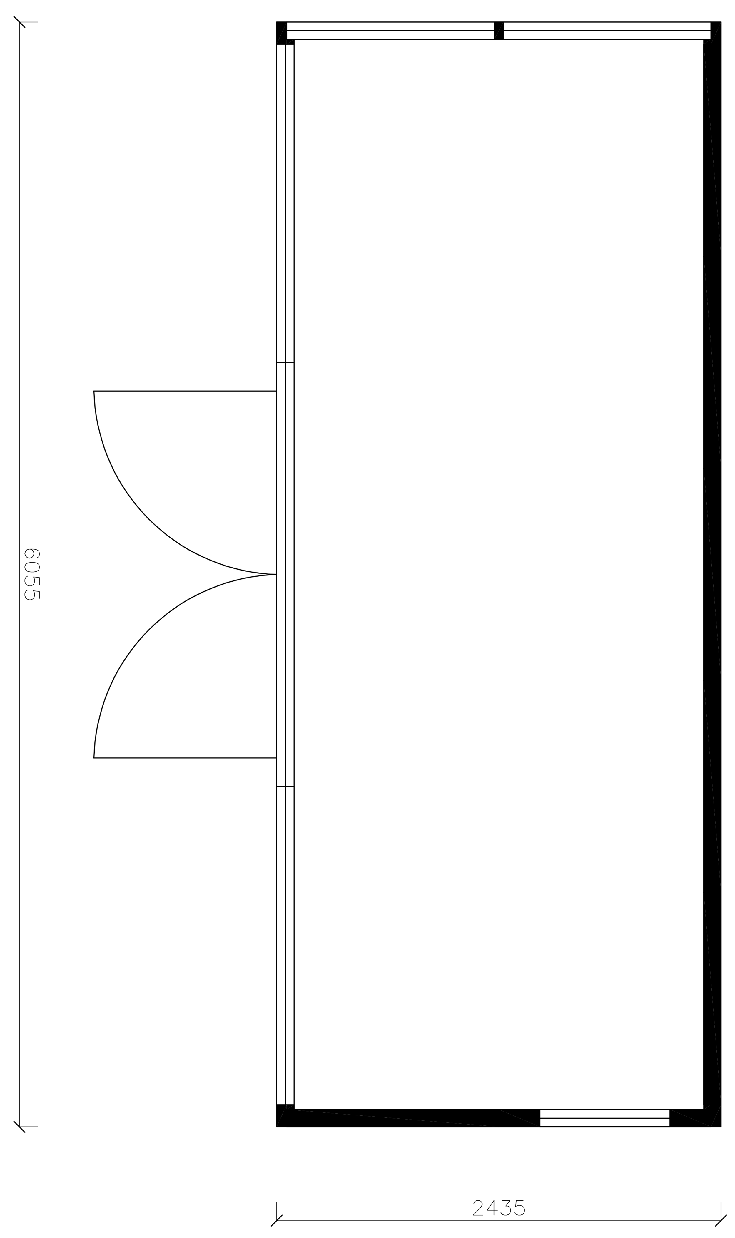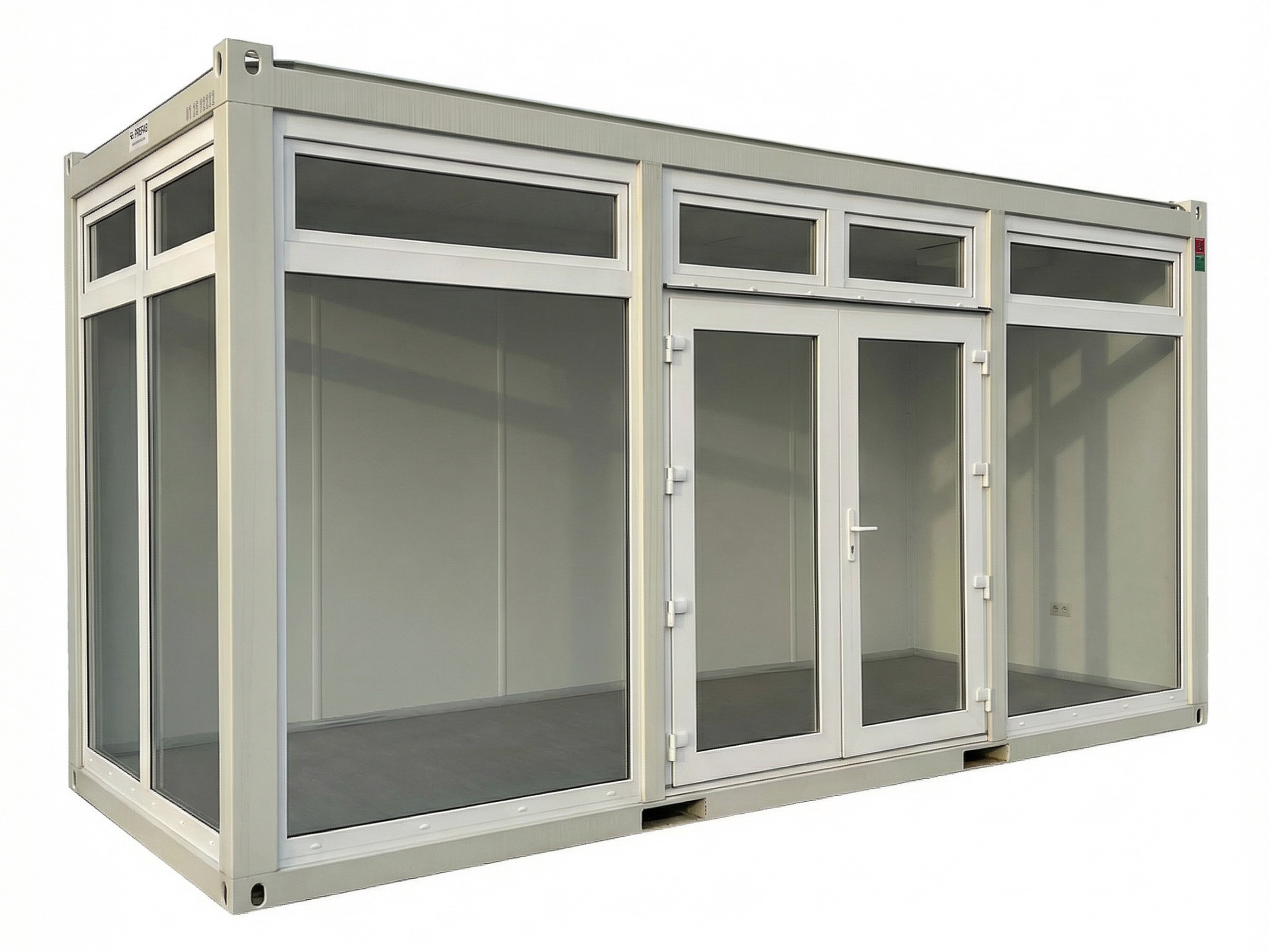 Modulo prefabbricato singolo con un lato lungo + un lato corto vetrati, composto da un'unica area, con porta sul lato lungo.