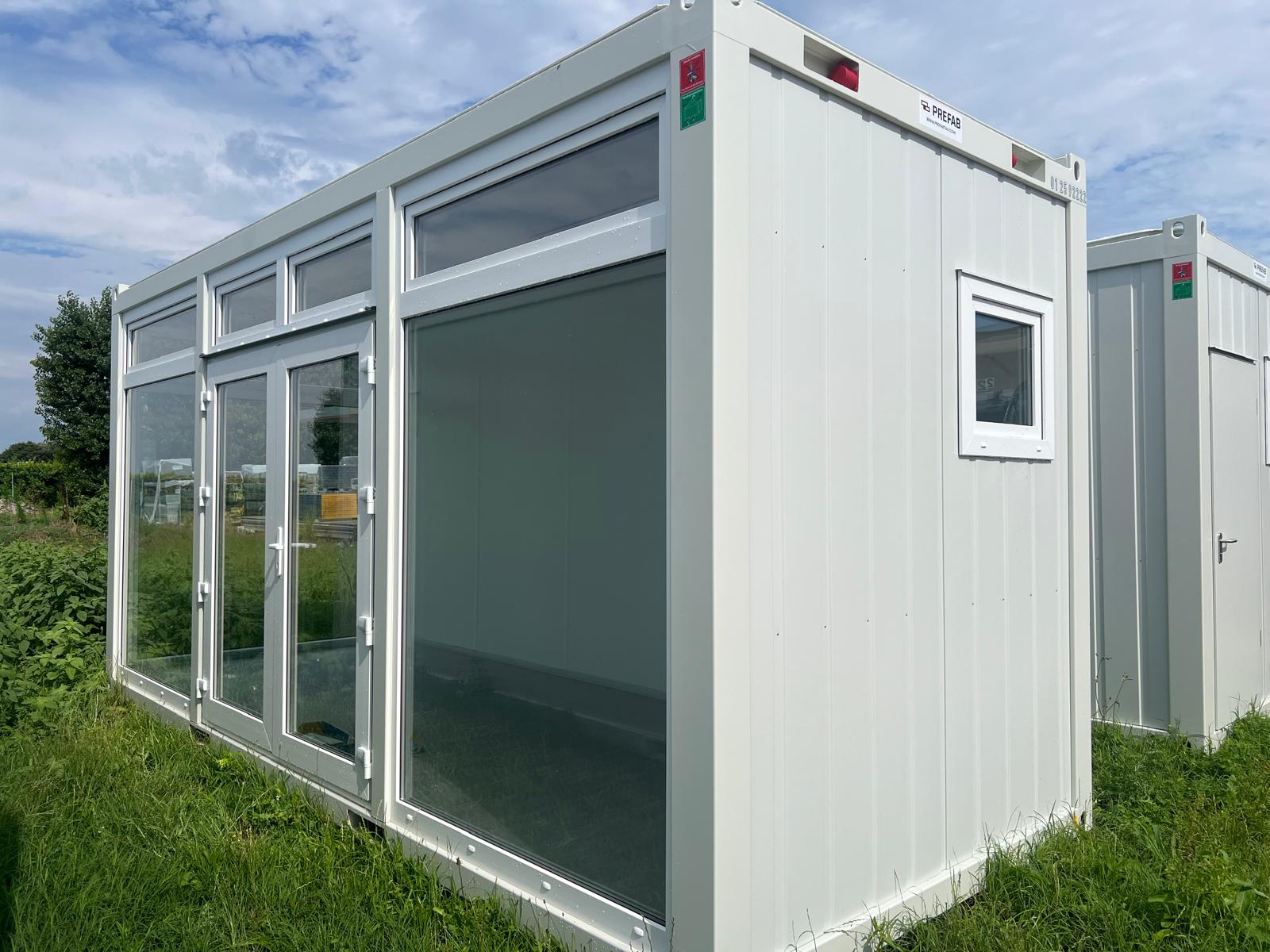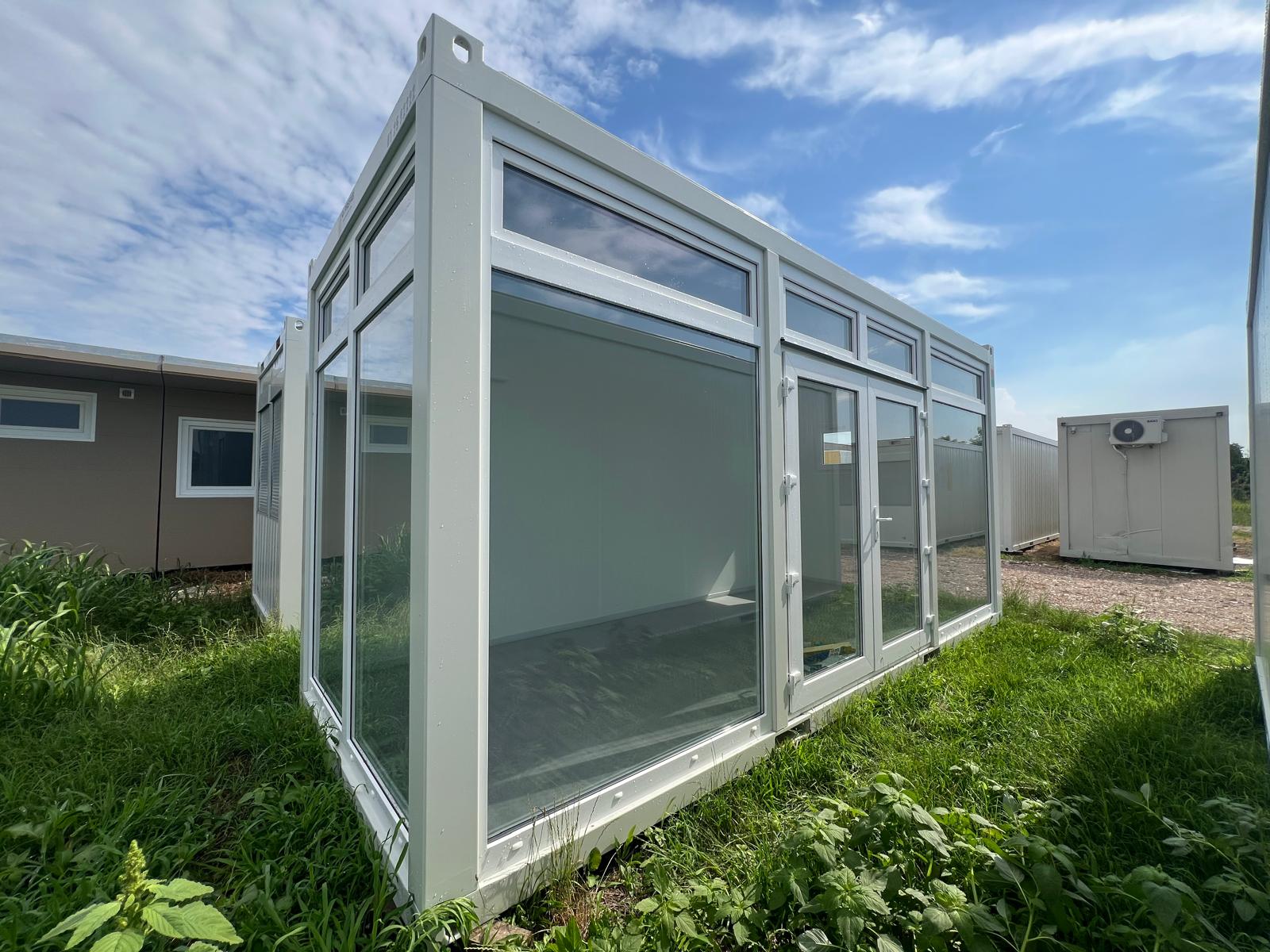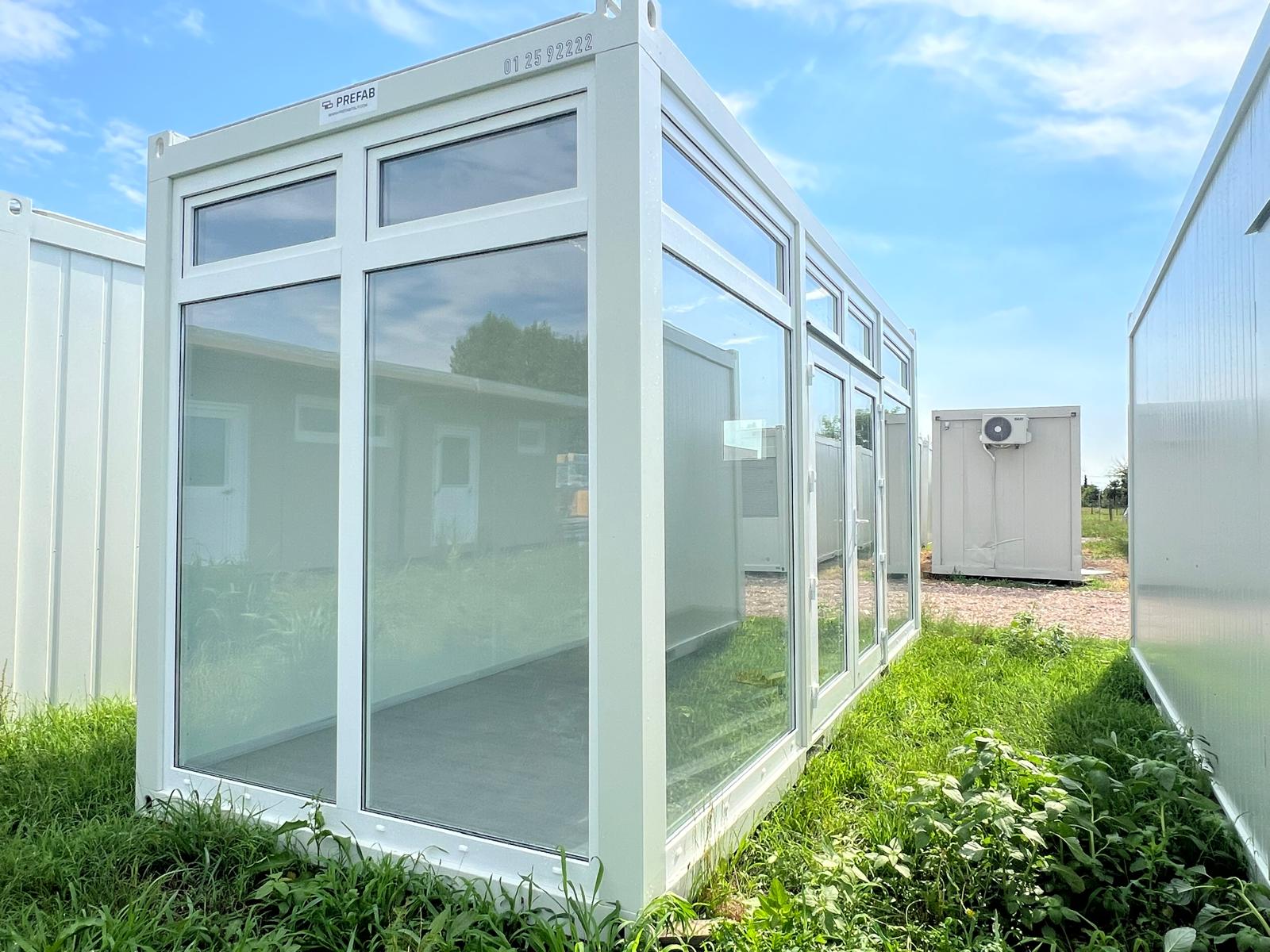 Modulo prefabbricato per uso shop / fiera / chiosco con n.ro 2 lati vetrati. Completo di impianto elettrico.