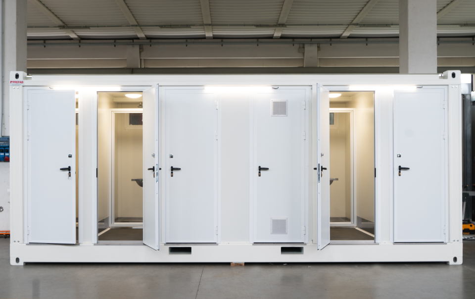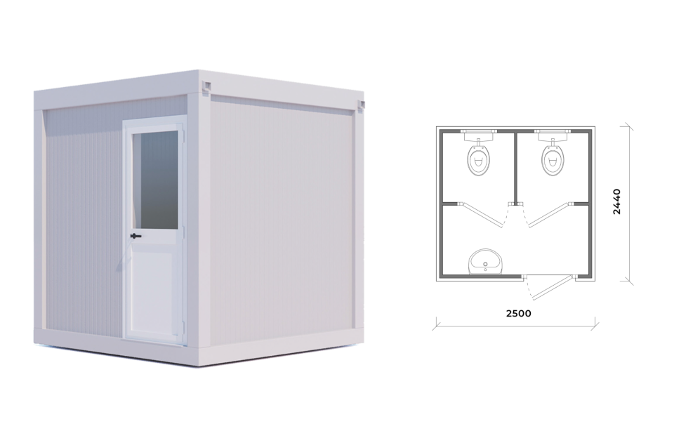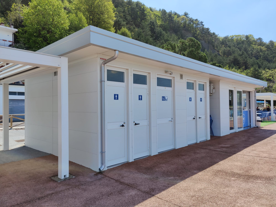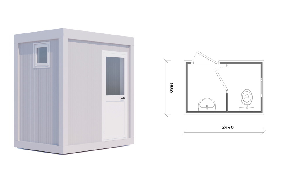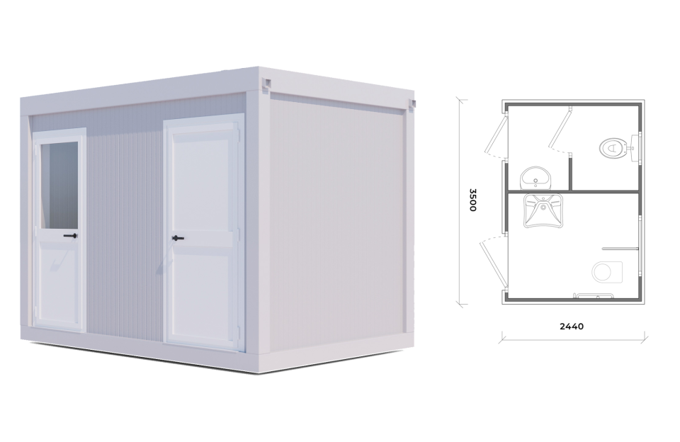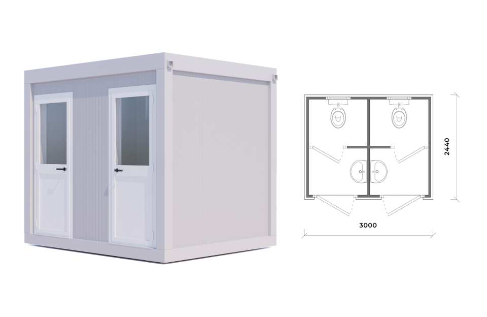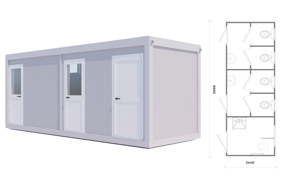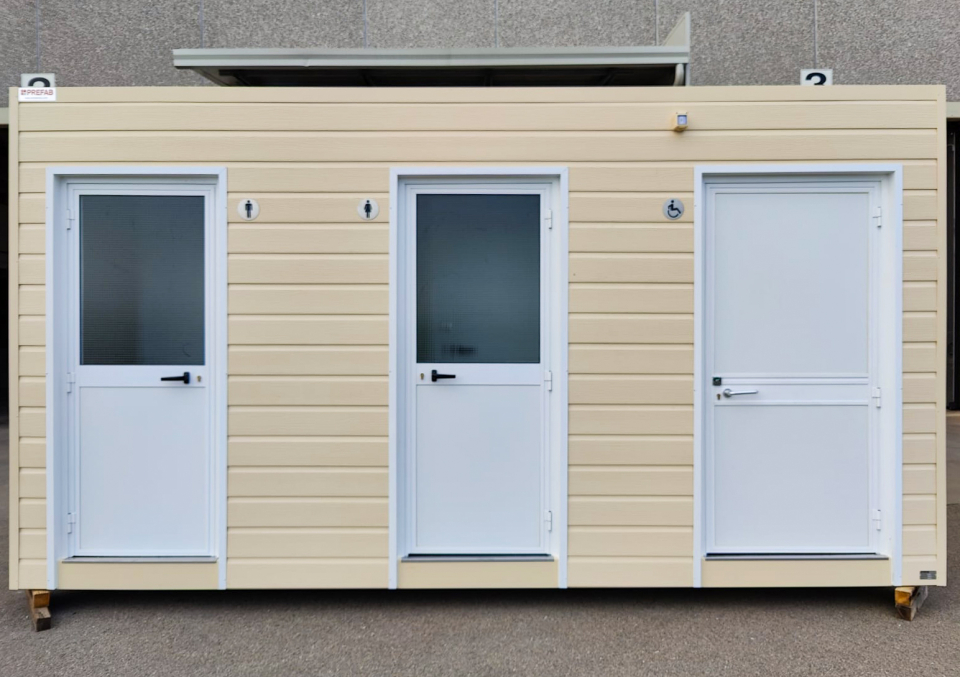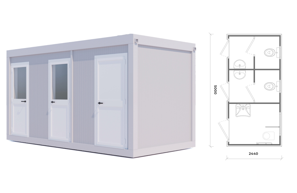 Linea di moduli prefabbricati coibentati in acciaio, completi di bagno o doppio bagno uomo/donna e antibagno con lavandino.
