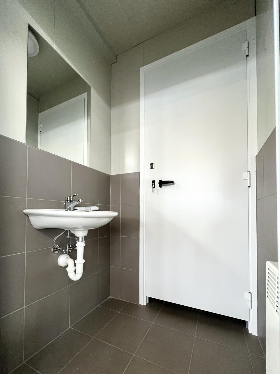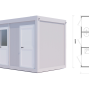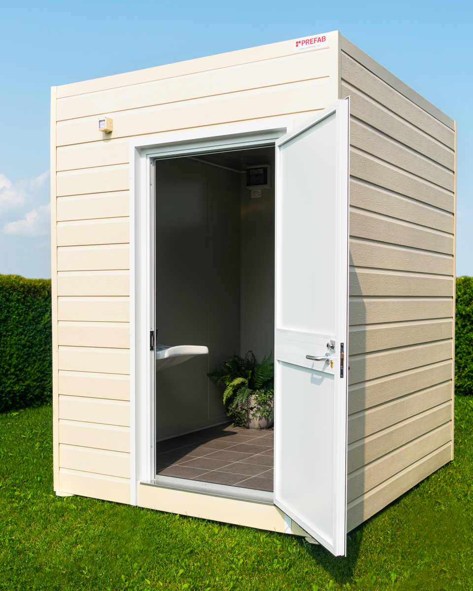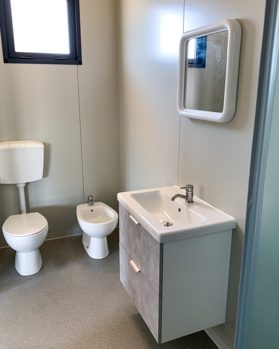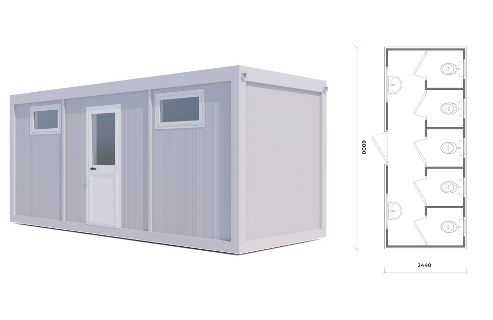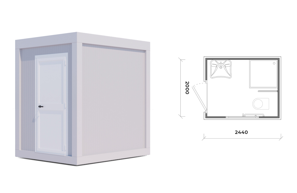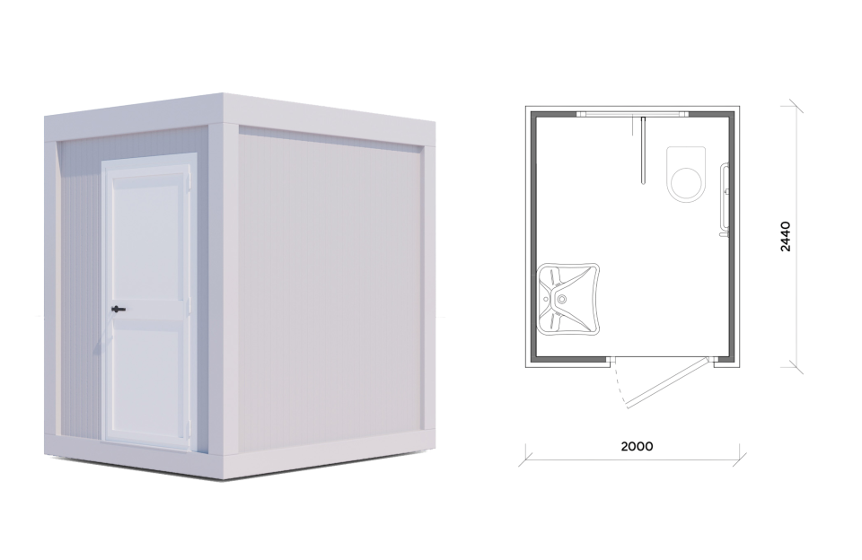 Linea di moduli prefabbricati coibentati in acciaio, completi di bagno o doppio bagno uomo/donna e antibagno con lavandino.